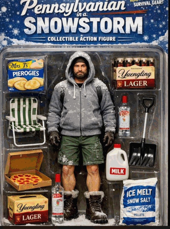Hi Keep. JBK here in Whitehall PA with an action figure that shows how we here in Pennsylvania prepare for and ride out a snow storm! LOL